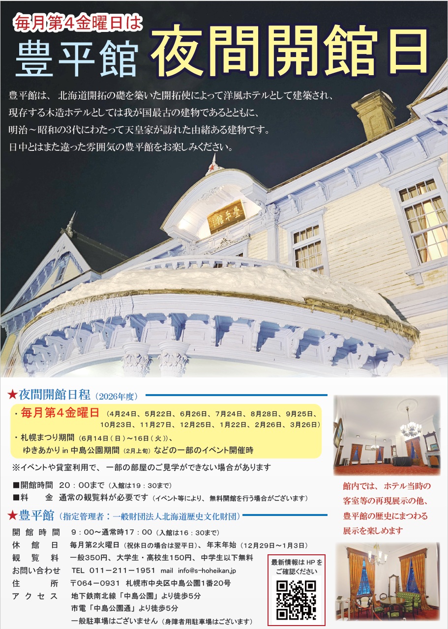 豊平館では、毎月第4金曜日と他期間、閉館時間を延長し20時まで開館します(入館は19時30分まで)。