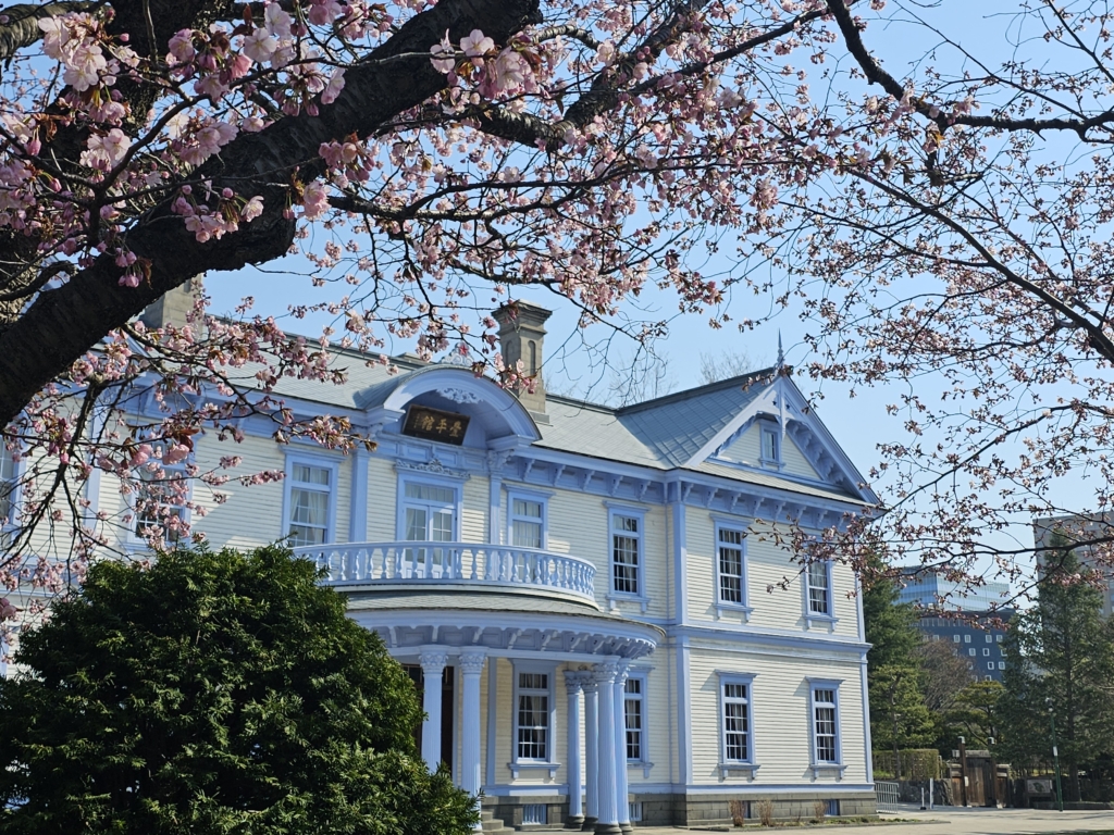 ピンク色の桜と、ウルトラマリンブルーの豊平館の風景が楽しめるのは、この時期ならでは。