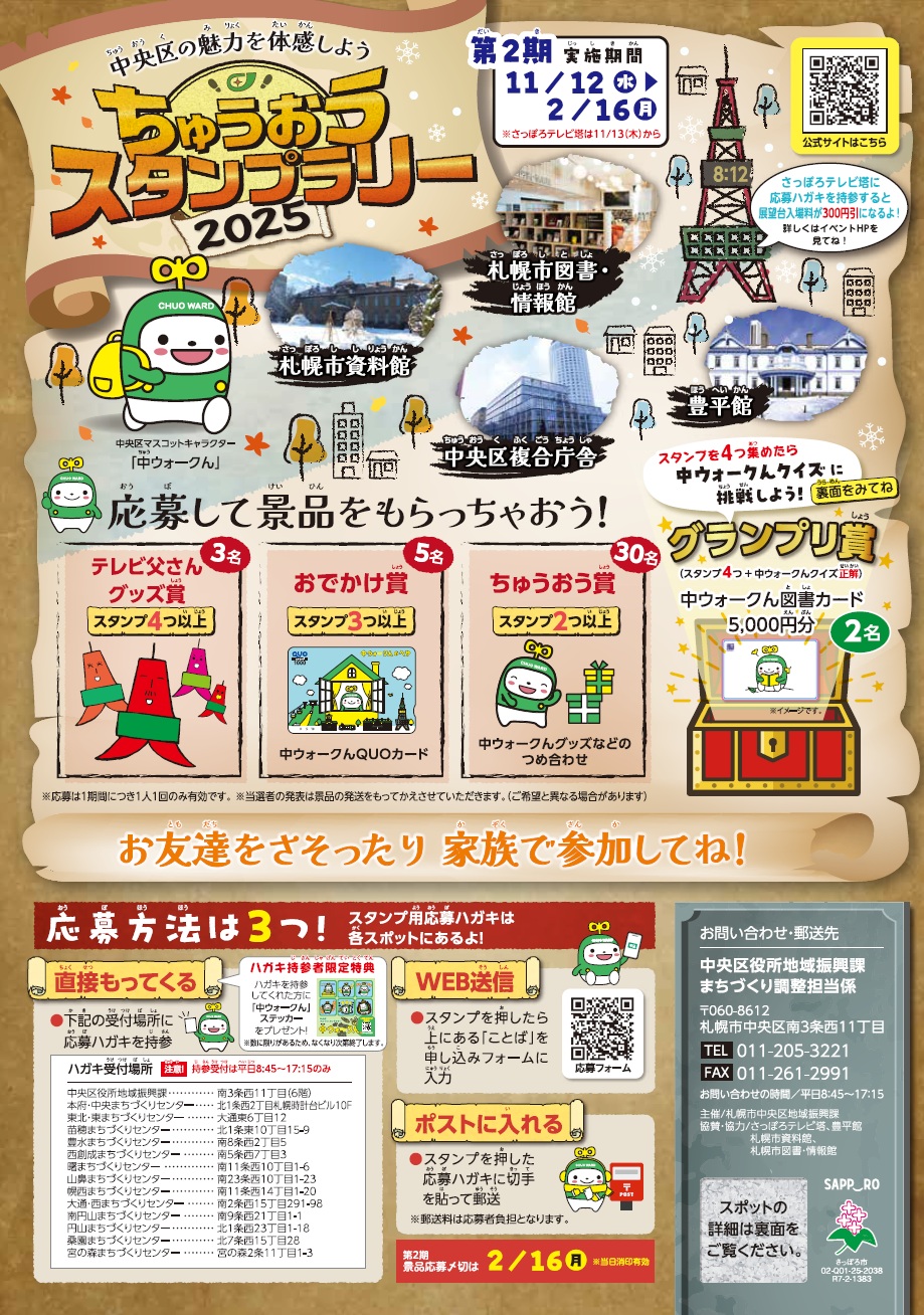 豊平館がある札幌市中央区(中央区市民部地域振興課)主催の「ちゅうおうスタンプラリー2025 第2期」が始まりました。(2026年2月16日まで)