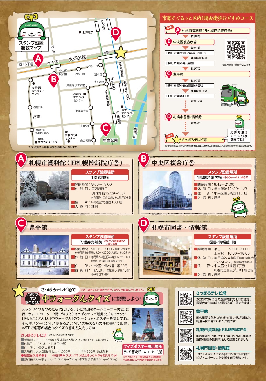 中央区内の4つのスポット(札幌市資料館(旧札幌控訴院庁舎)、中央区複合庁舎、豊平館、札幌市図書・情報館)を巡って各施設に設置している中央区のマスコットキャラクター「中ウォークん」のスタンプを集めながら、中央区の魅力を体感するイベントです。